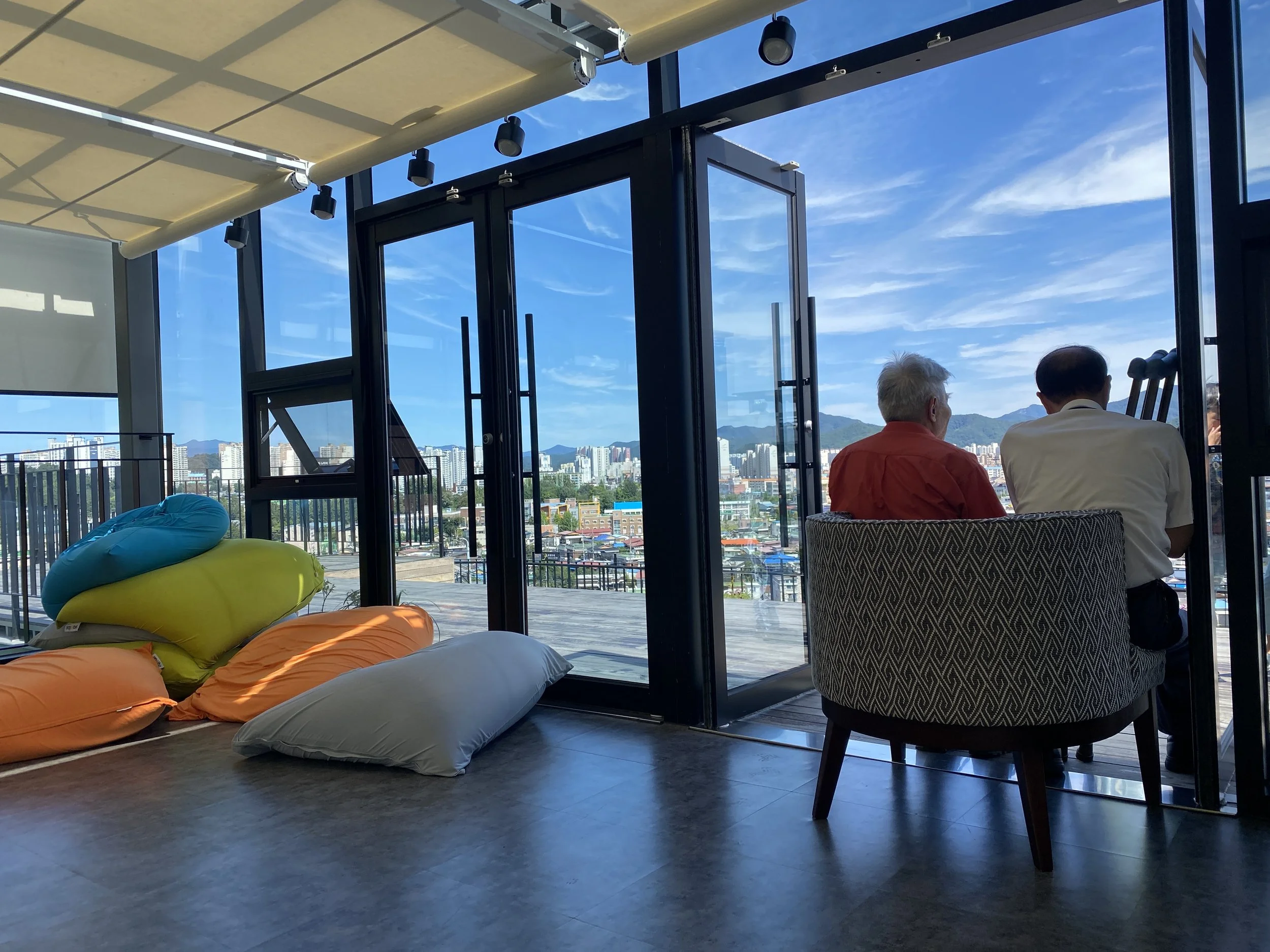 My favorite was the the outdoor area on the third floor where you can enjoy the picturesque view of the city and mountains. On the balcony were bean bags and wide steps to sit in groups and families to chat around.
